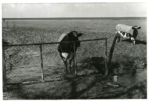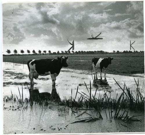 Foto in zwart-wit van koeien in een wel erg nat weil...