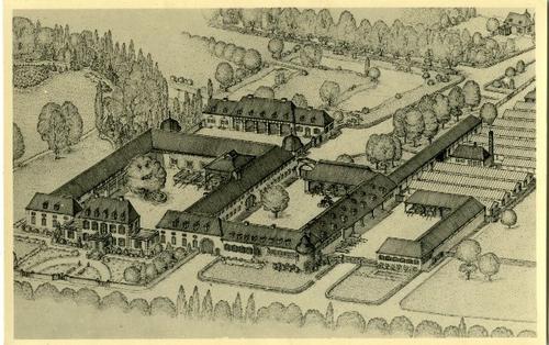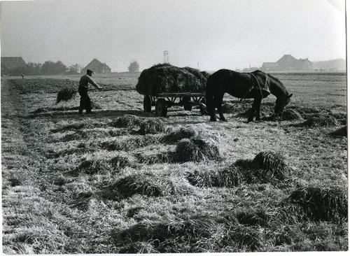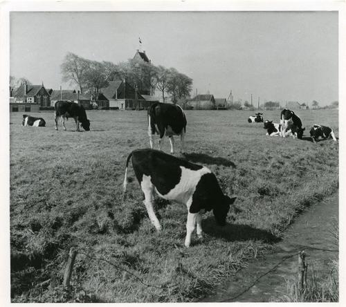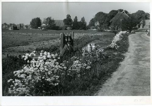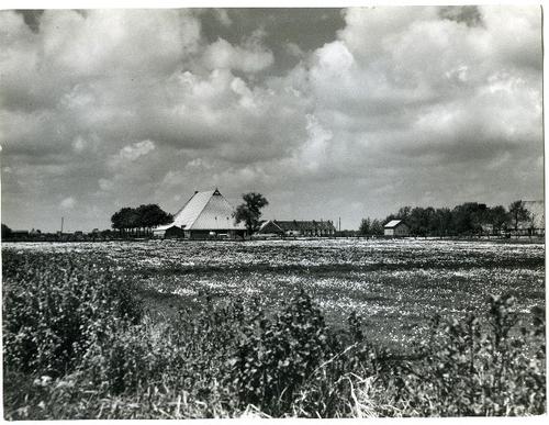 Foto in zwart-wit van een aantal boerderijen gelegen...
