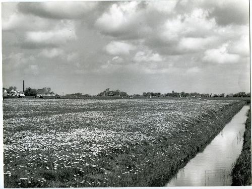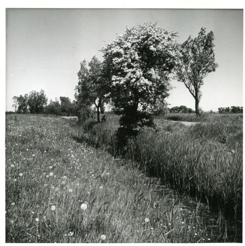 Foto in zwart-wit van een slootkant met veldbloemen ...