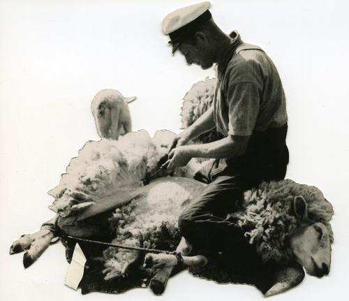 Foto in zwart-wit van het scheren van een schaap doo...