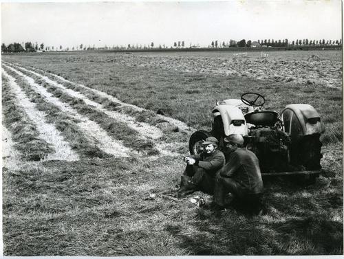 Foto in zwart-wit van twee mannen bij een tractor do...