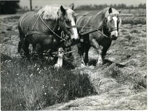 Foto in zwart-wit van een span paarden voor een maai...
