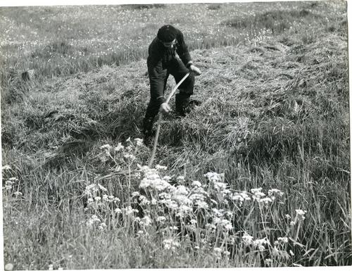 Foto in zwart-wit van met een zeis maaien van gras b...