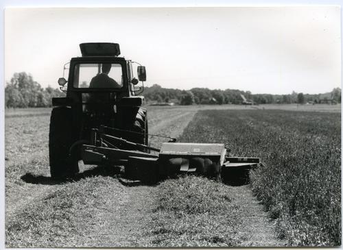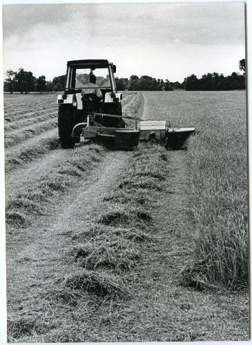 Foto in zwart-wit van een tractor met een cyclomaaie...