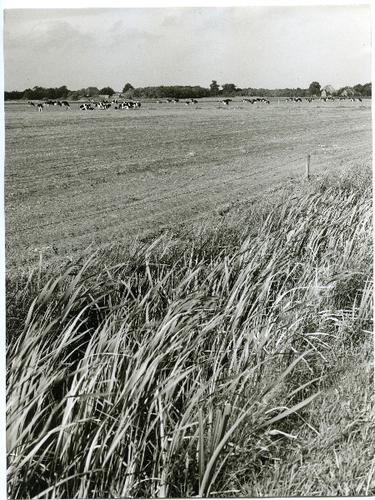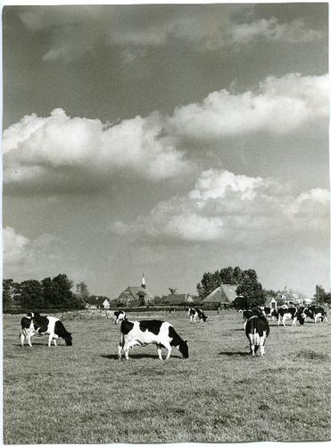 Foto in zwart-wit van een weiland met koeien bij Mil...