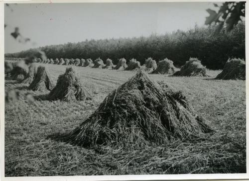 Foto in zwart-wit van korenschoven op het land, 1951