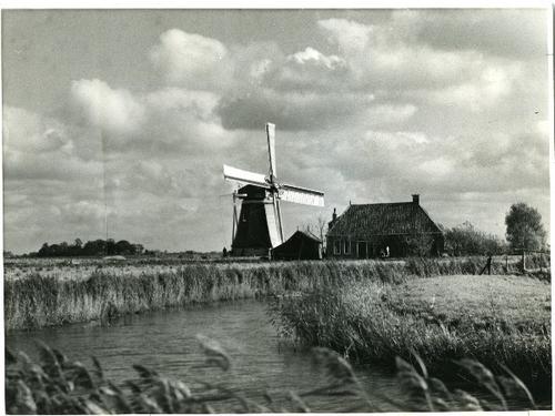 foto in zwart-wit van polderlandschap met molen door...