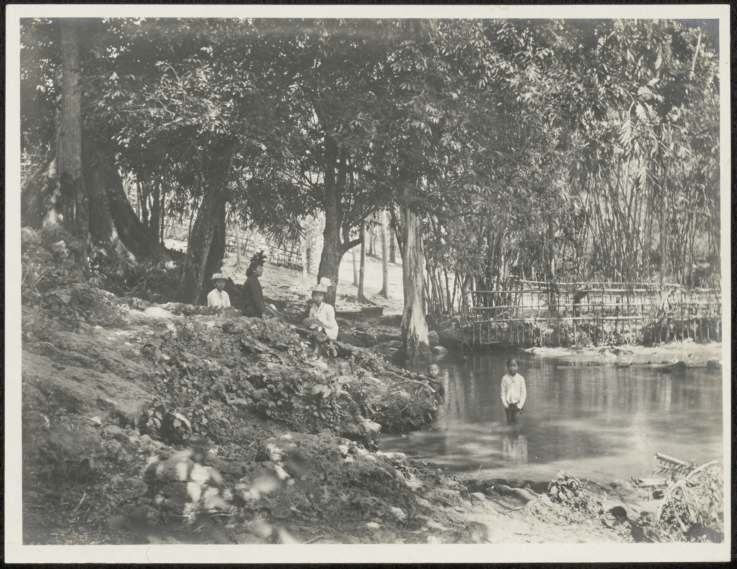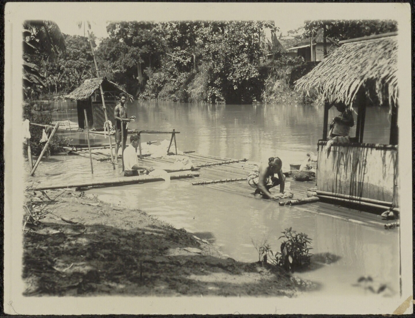 Wasvrouwen en de wasbaas bij de wasplaats te Batavia