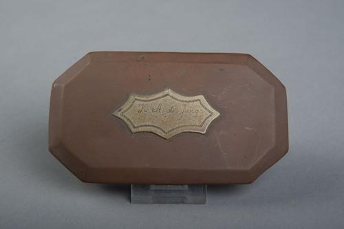 Koperen tabaksdoos met zilveren plaatje