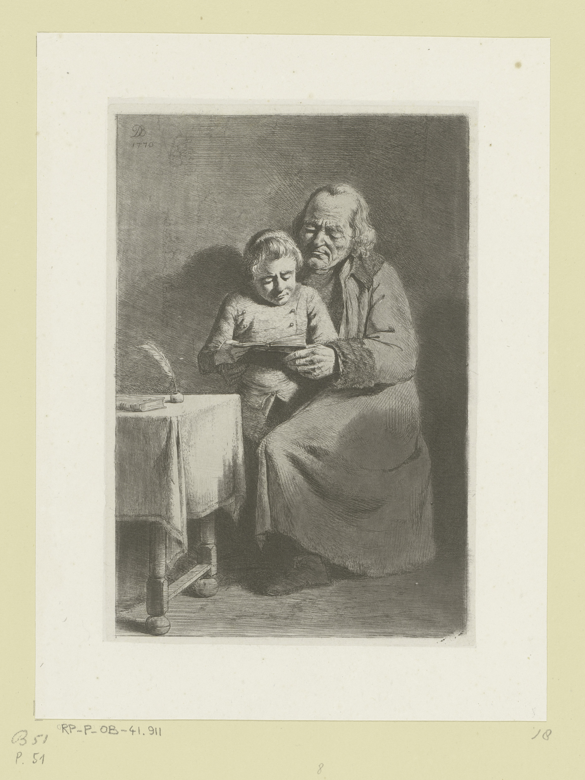Kinderen met hond spelend, achter hen twee oude vrou...
