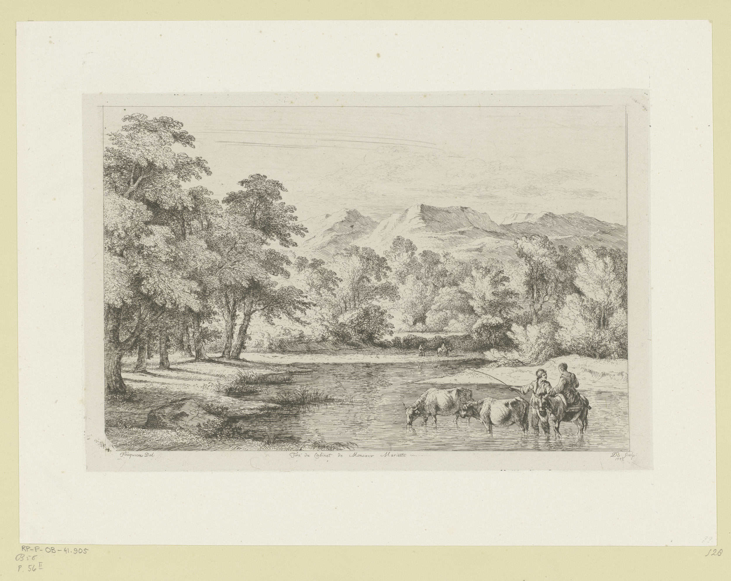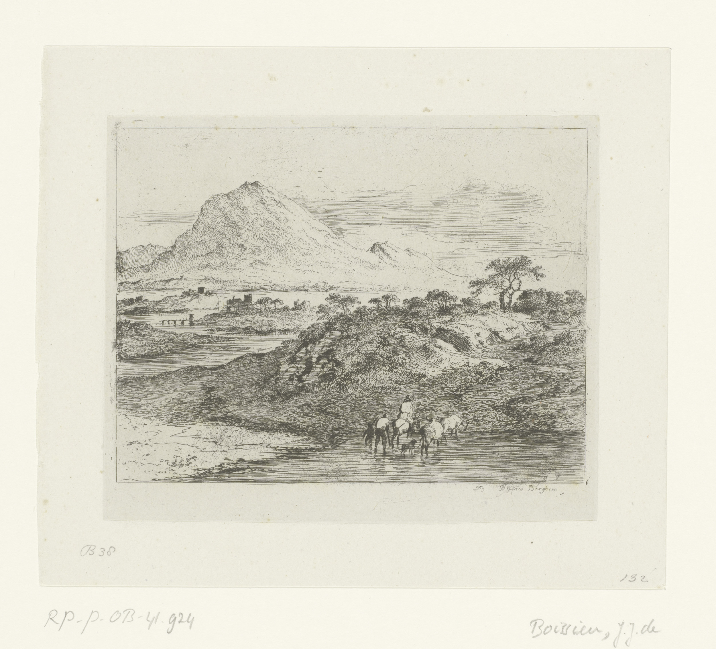 Heuvelachtig landschap met figuren bij een doorwaadb...
