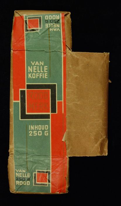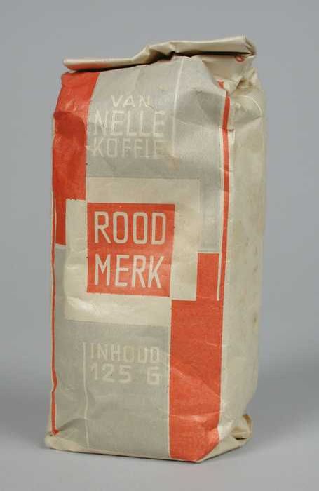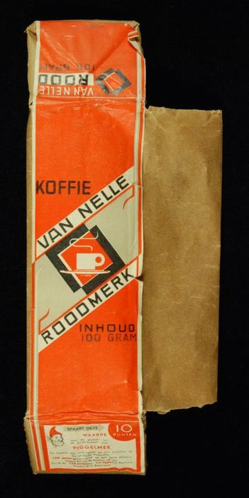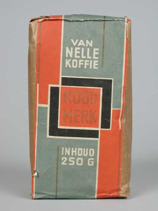 Wit en rood, kartonnen pak VAN NELLE'S ROODMERK KOFF...