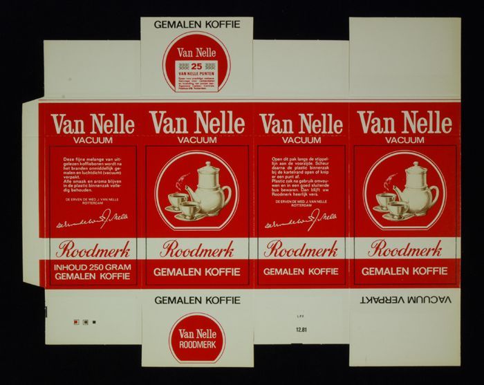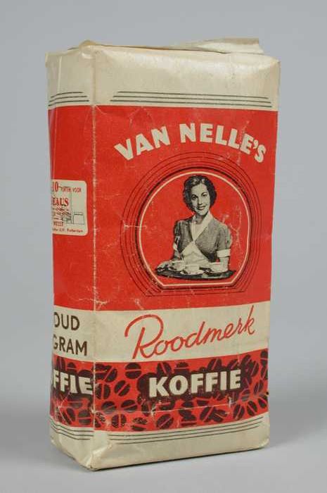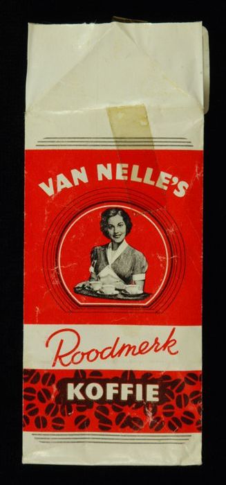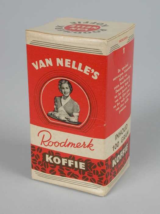 Wit en rood, kartonnen pak VAN NELLE ROODMERK KOFFIE...