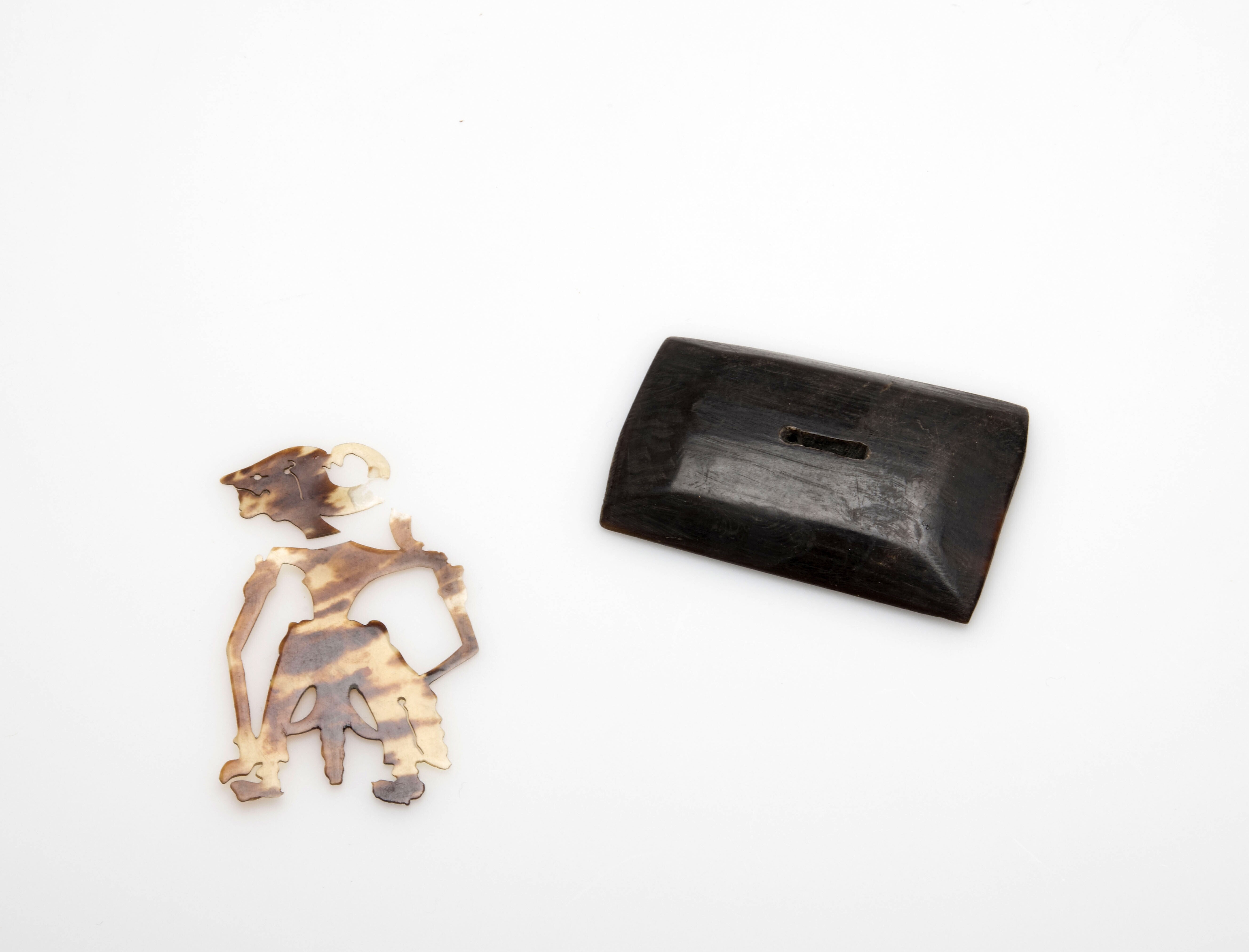 Schildpad wayangfiguur op zwart hoornen voetstuk