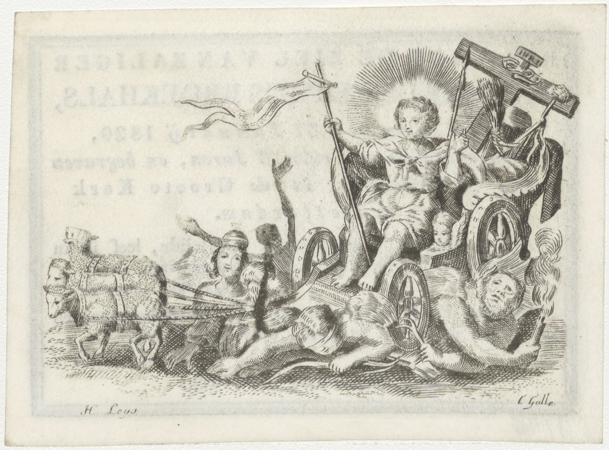 Christuskind op triomfwagen, kz. Bid voor ziel Broek...
