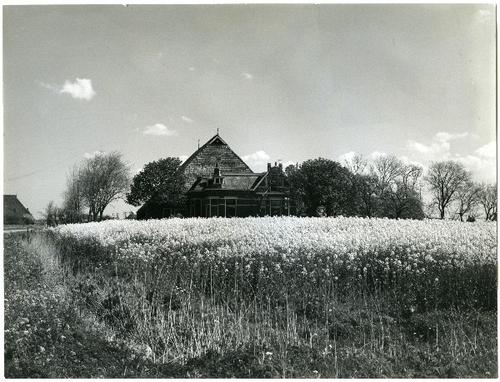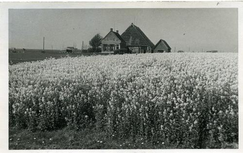 Prentbriefkaart in zwart-wit van een koolzaadveld, 1949