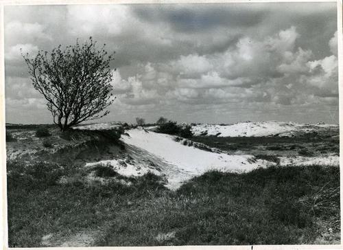 Foto in zwart-wit van een duinlandschap met stuifdui...