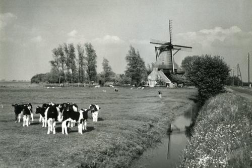 Foto in zwart-wit van een stellingmolen met molenaar...