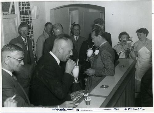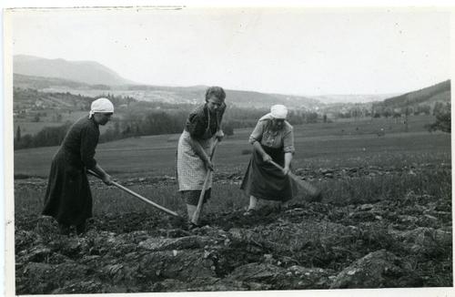 Foto in zwart-wit van drie vrouwen met een hak, 1951