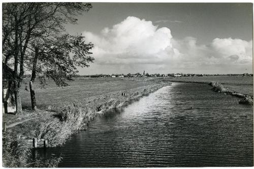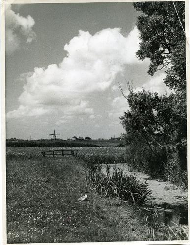 Foto in zwart-wit van een poldervaart met weilanden ...