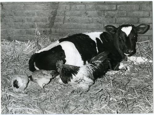 Foto in zwart-wit van een kalf en kippen in het stro...