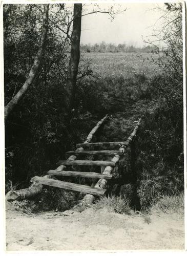 Foto in zwart-wit van een eenvoudig bruggetje door J...