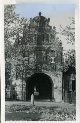Foto in zwart wit van de poort van het Poptaslot te ...