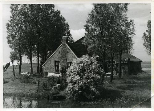Foto in zwart-wit van een kleine boerderij met erf e...