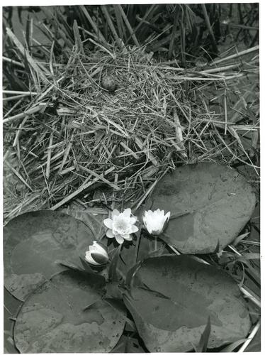 Foto in zwart-wit van een nest tussen waterlelies do...