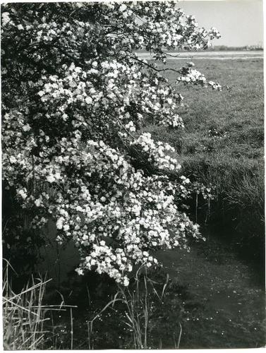 Foto in zwart-wit van bloeiende weilanden met sloot ...
