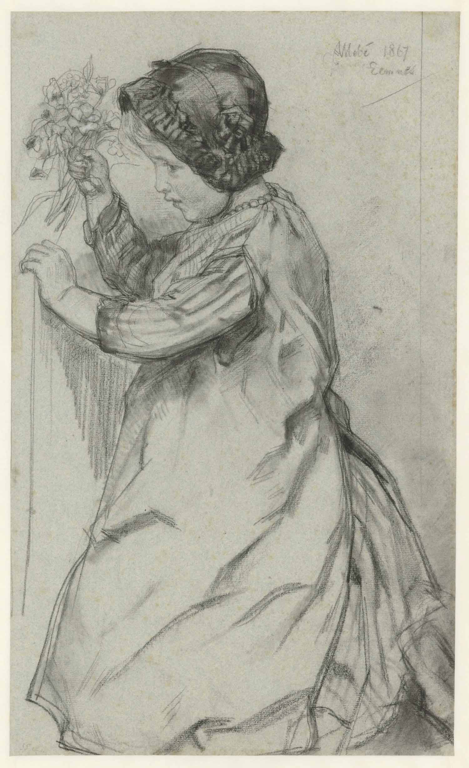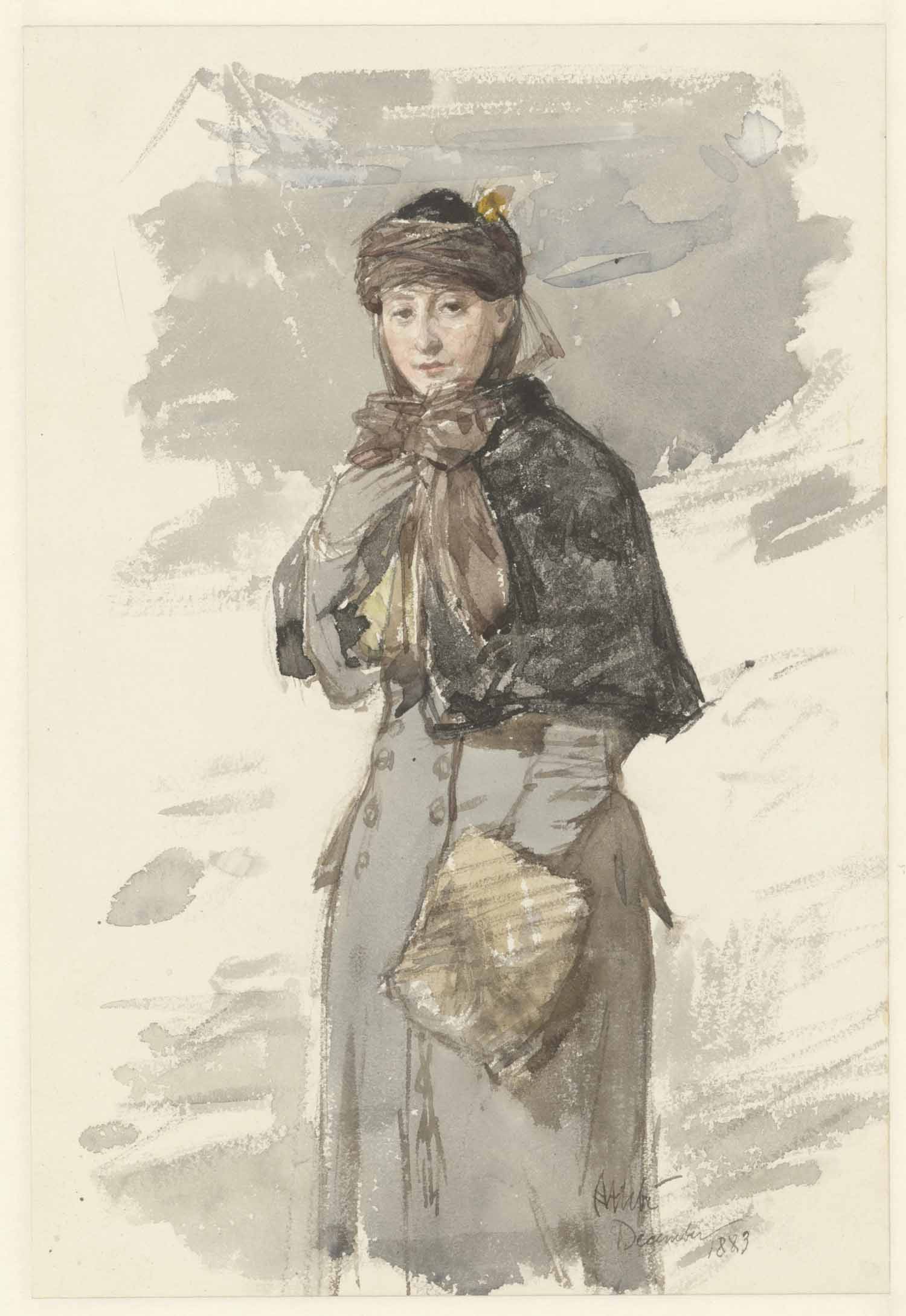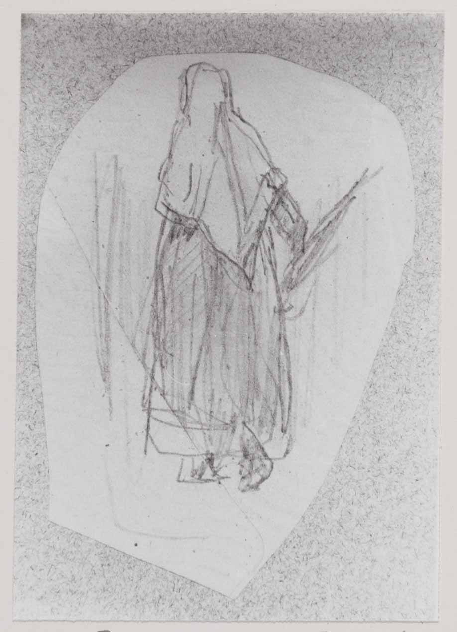 Staande vrouw in lang gewaad, van achteren gezien