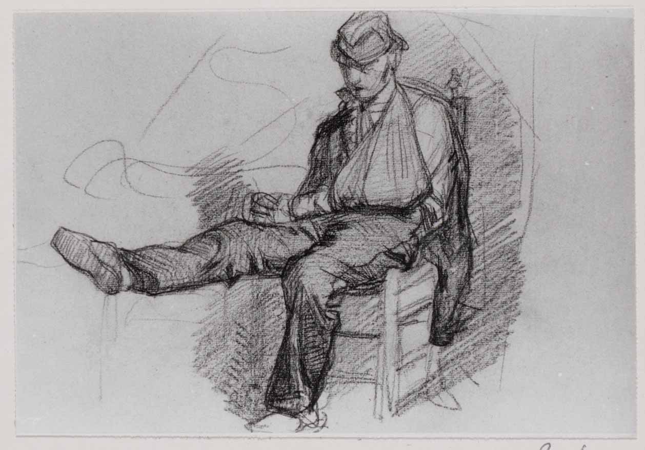 Zittende man met arm in mitella en been omhoog