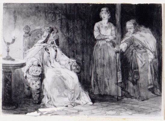Staande vrouw en zittend figuur, in oosterse kledij