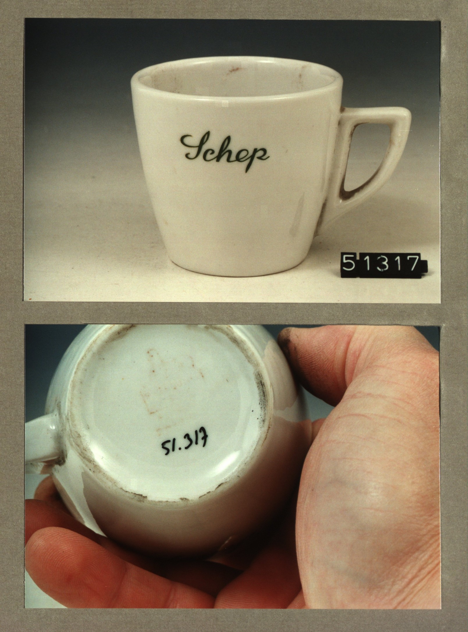 Kop met opschrift, model P2 met decor Schep Oud Beie...