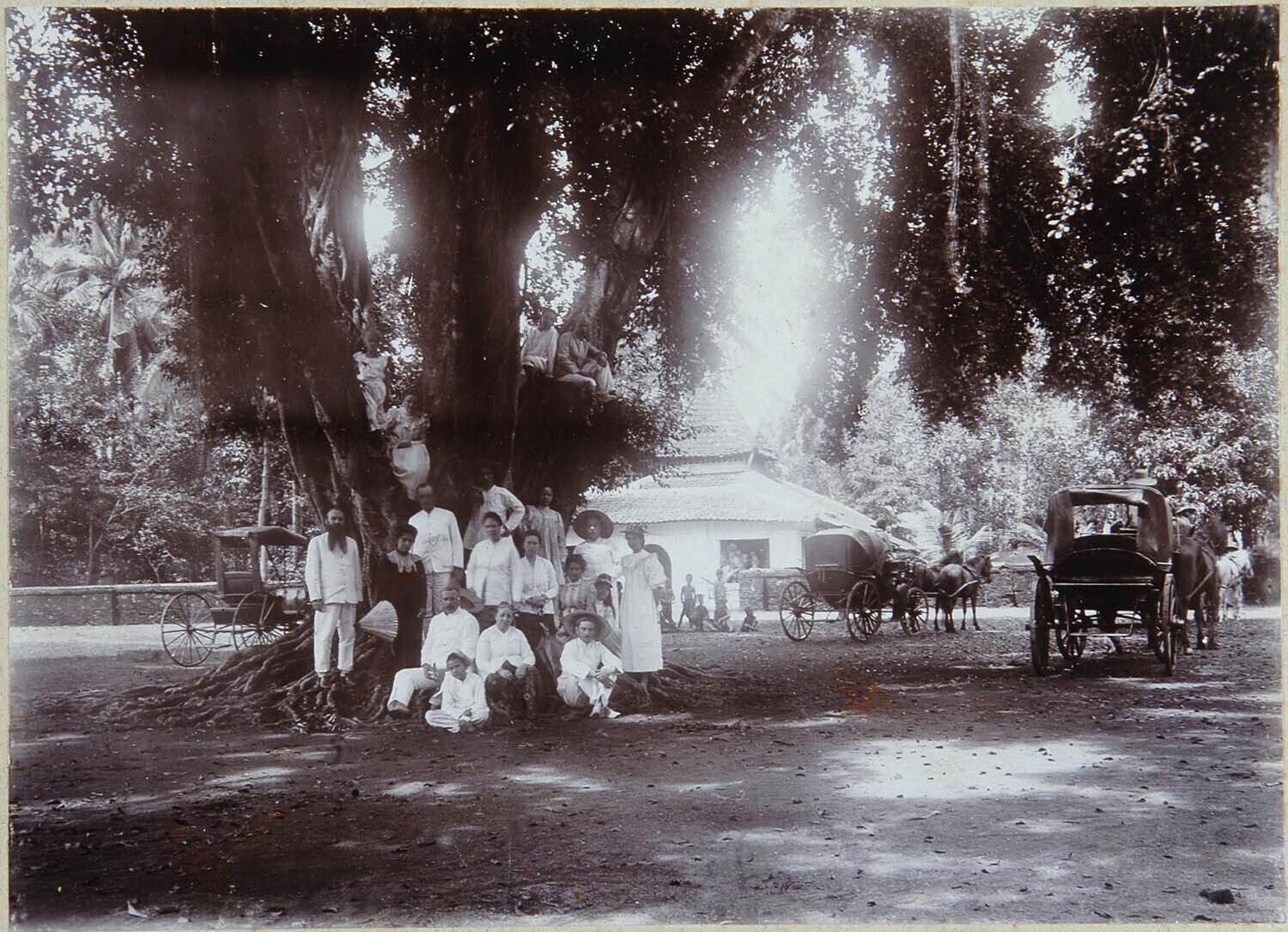 Groepsportret bij een feestelijke aangelegenheid op ...