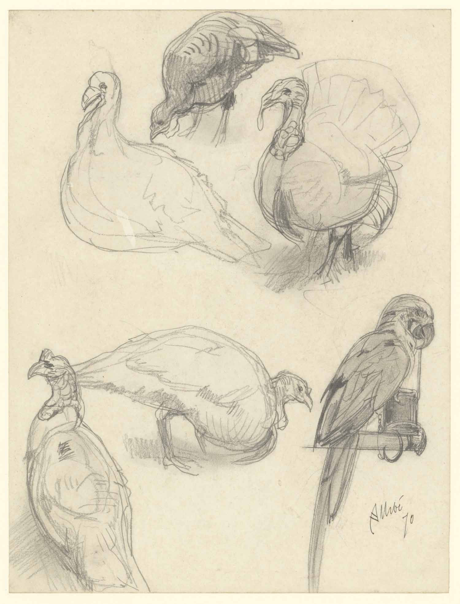 Studieblad met ara en kalkoenen