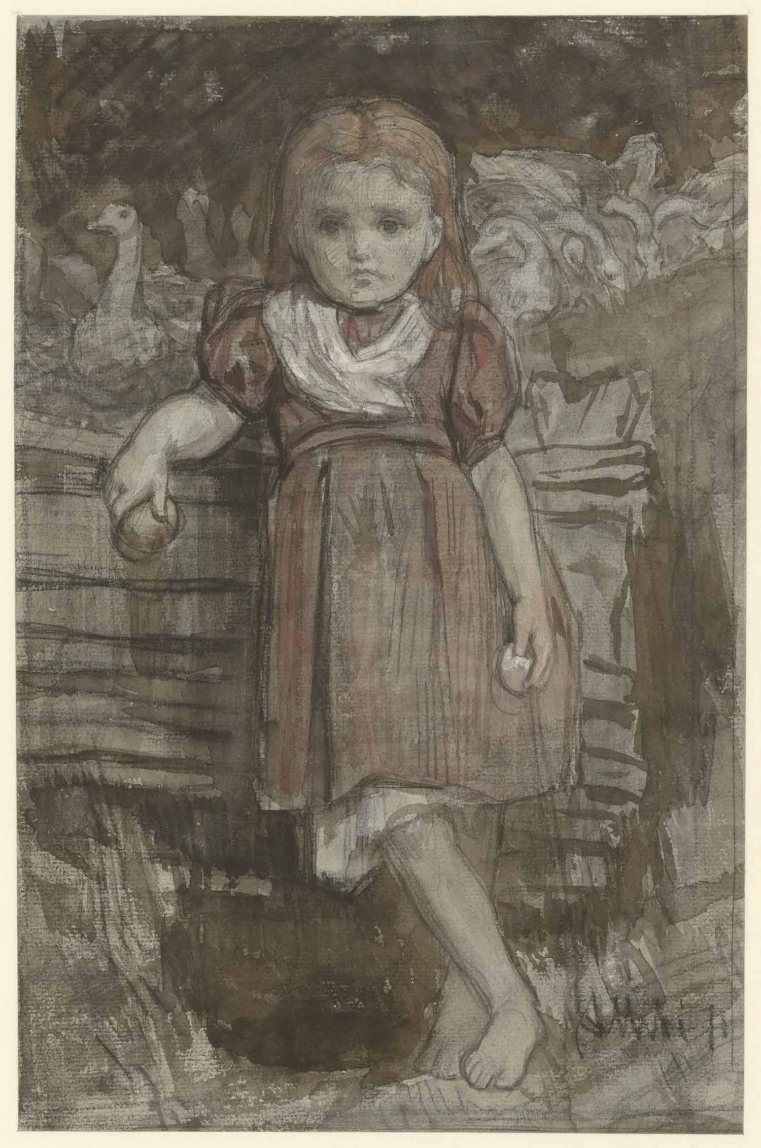 Een meisje met ganzeneieren in een tuin, met ganzen ...