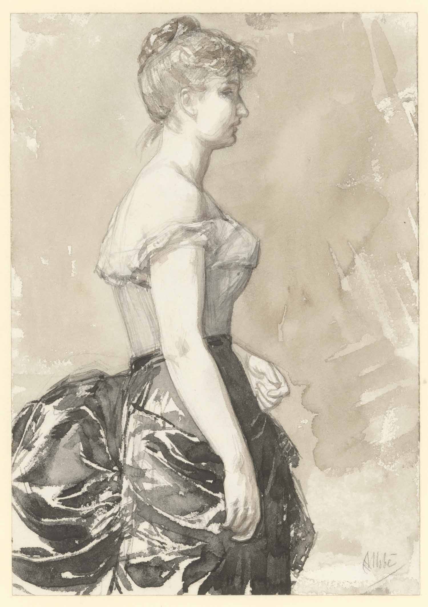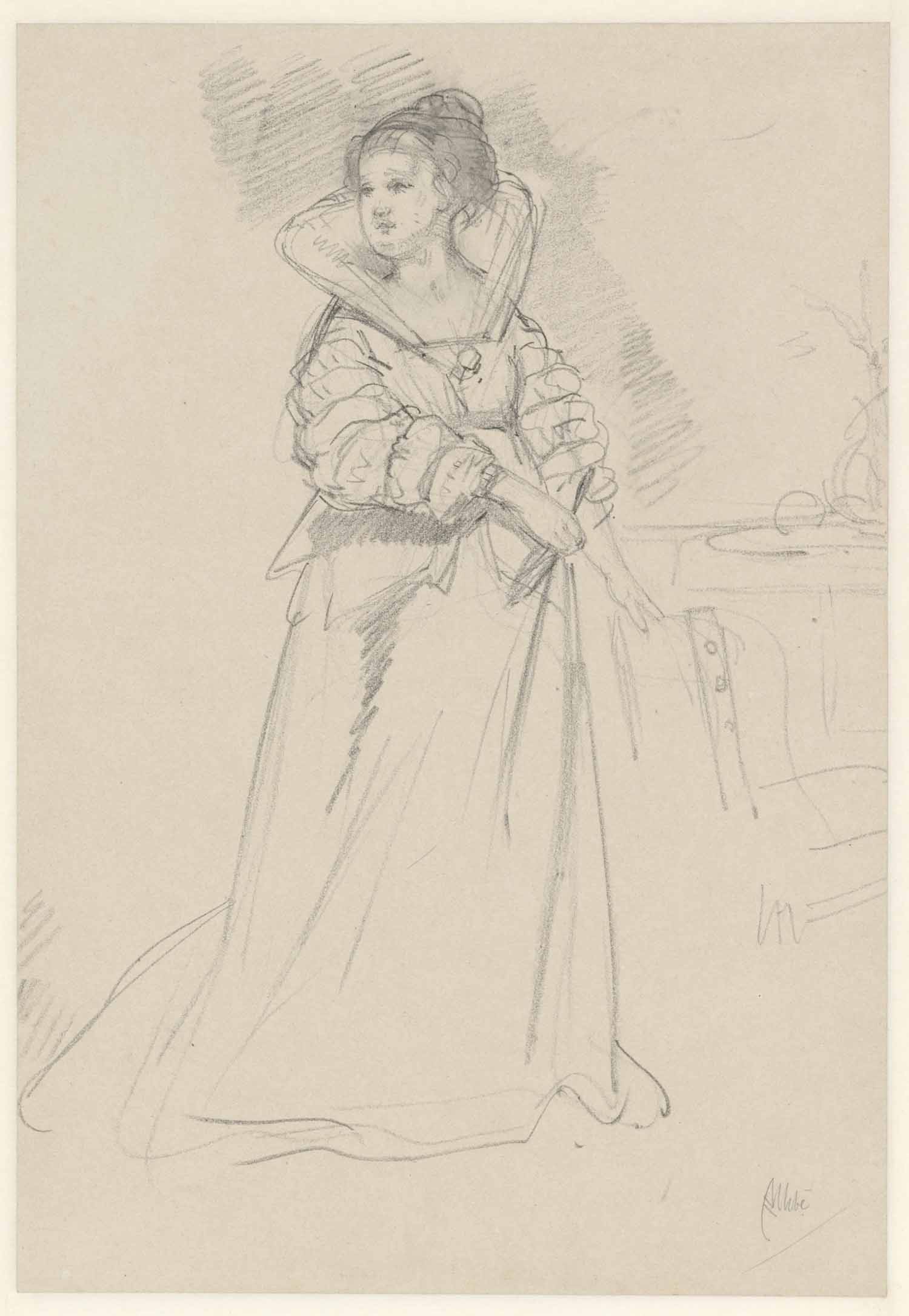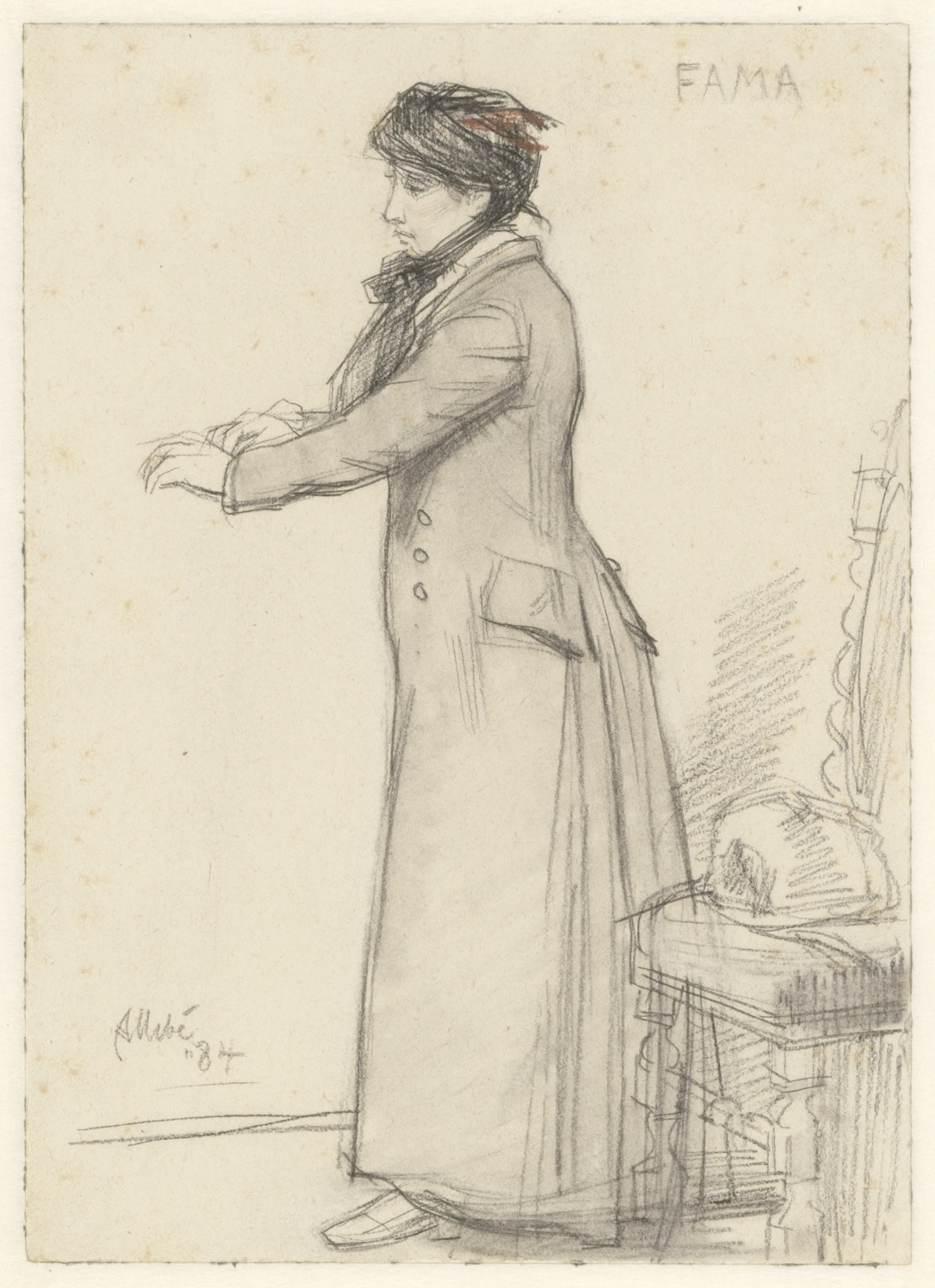 "Fama", vrouw haar handschoen aantrekkende