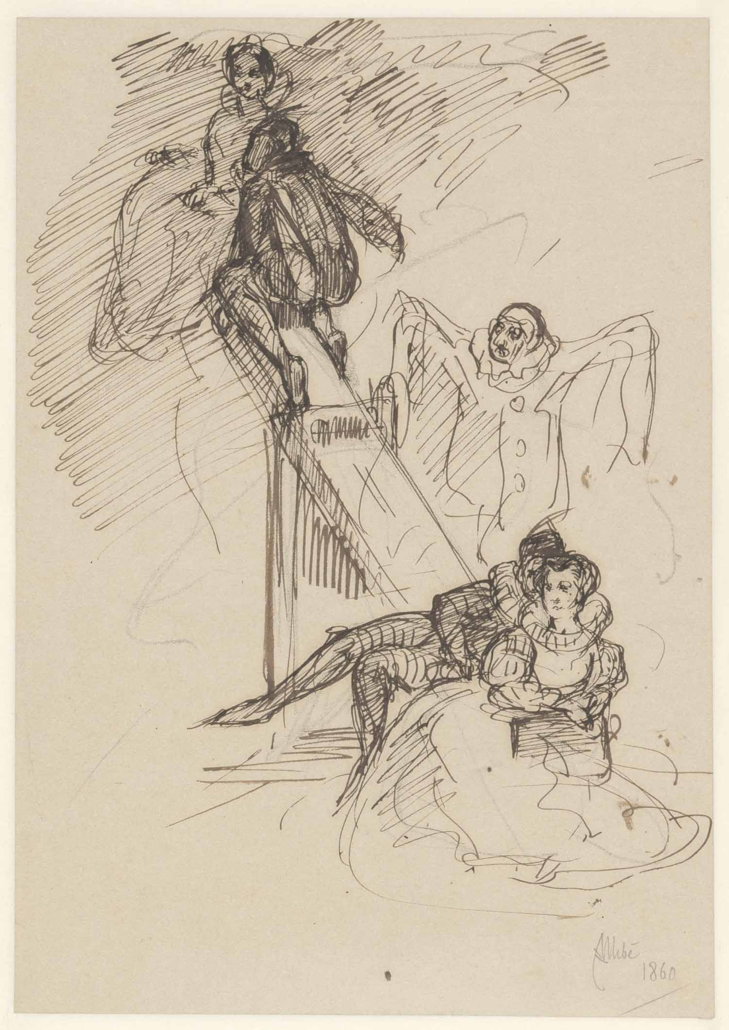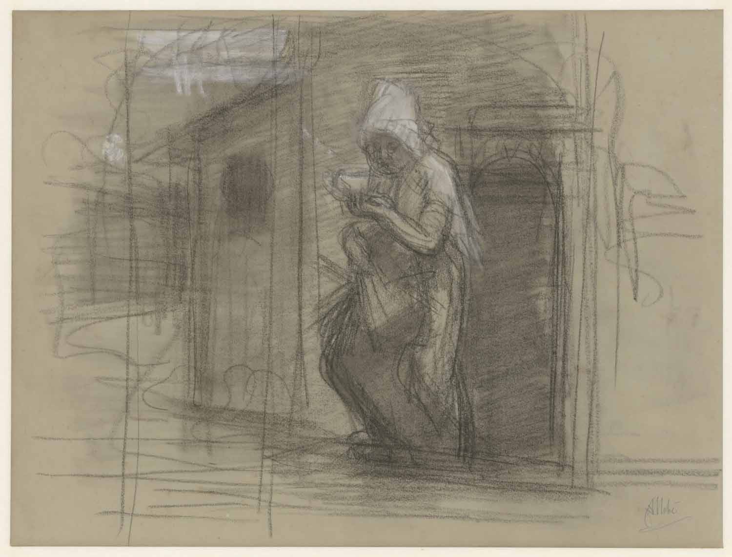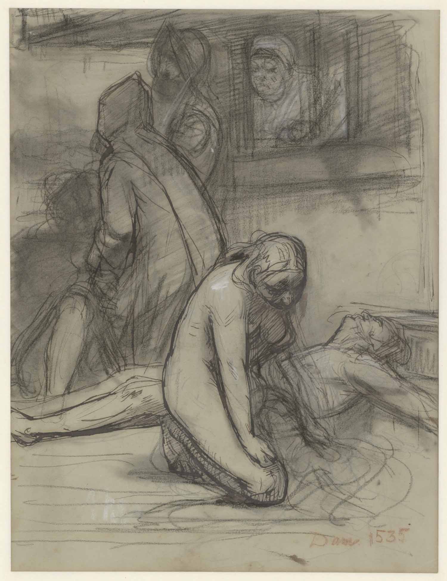 Vrouw uit een huis komende. Man en liggende vrouw (v...