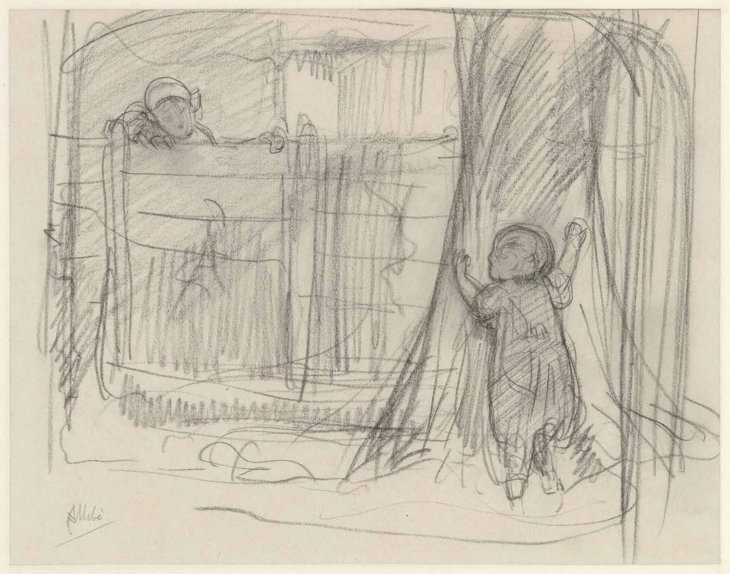 Kind achter een boom en vrouw over een hek kijkende....