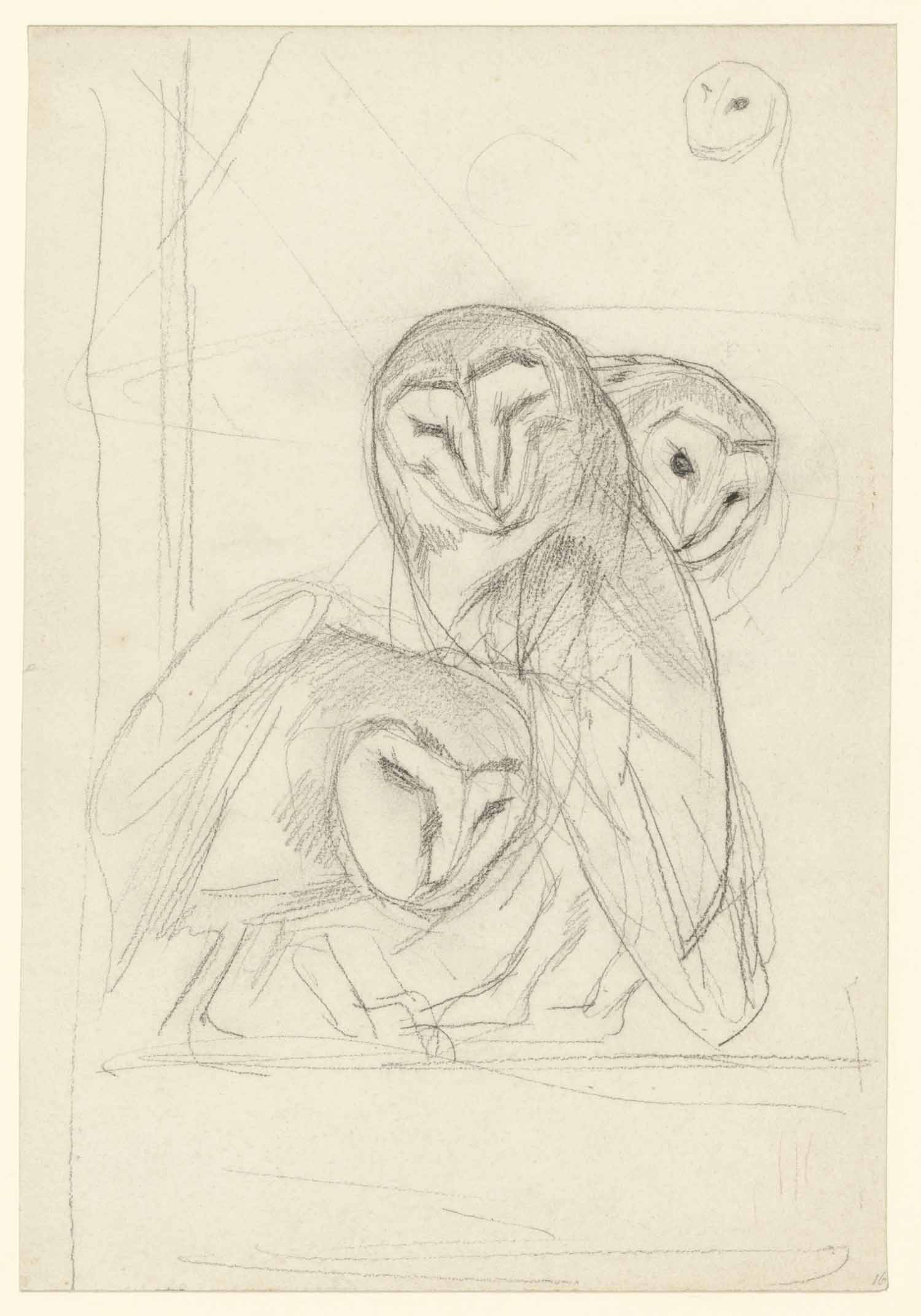 Drie kerkuilen (recto). o.a. schetsje van staande vr...
