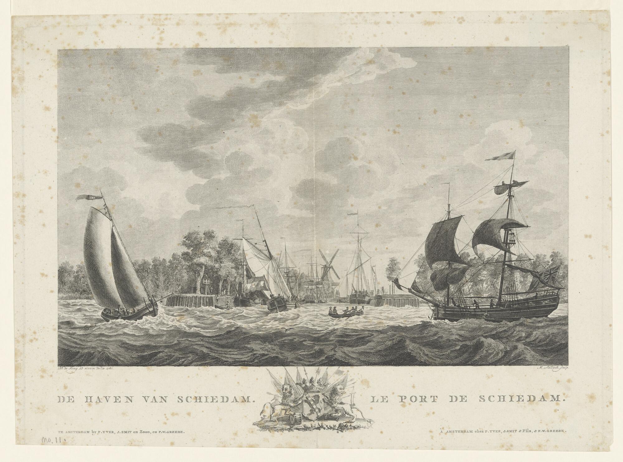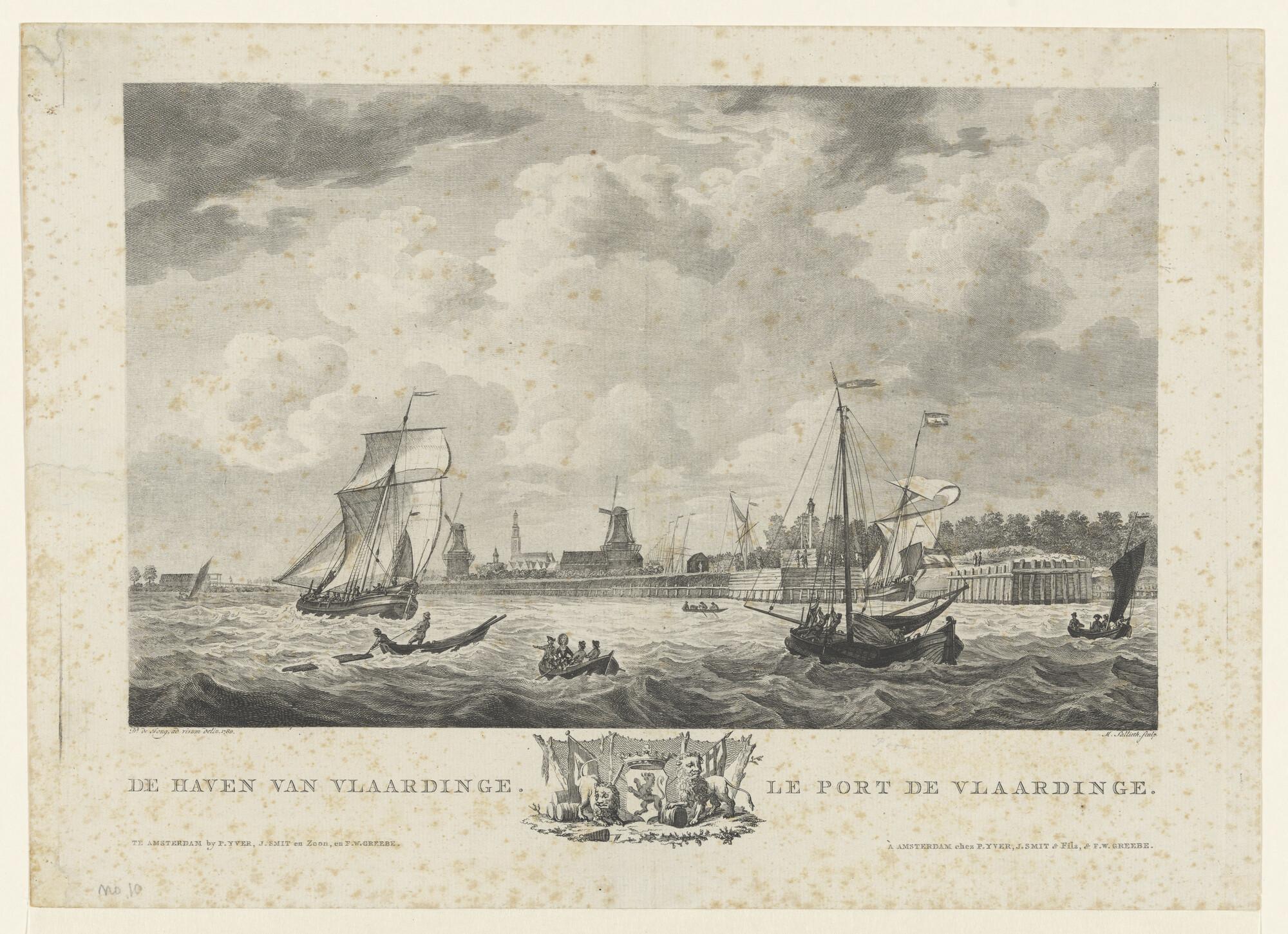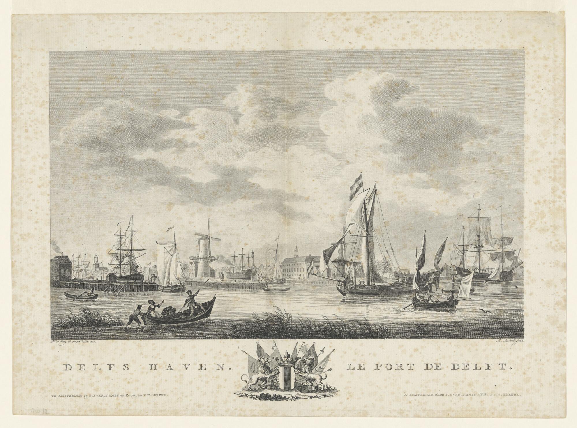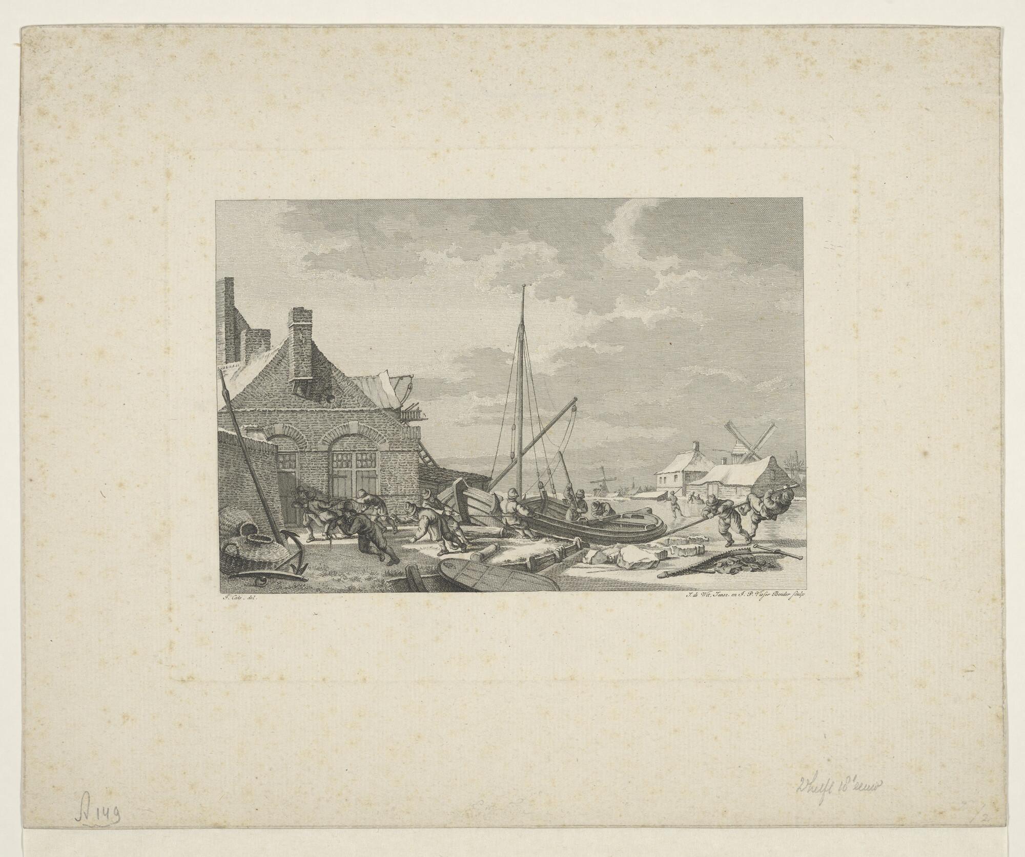 Een havengezicht, met rechts een woonhuis, waarbij e...