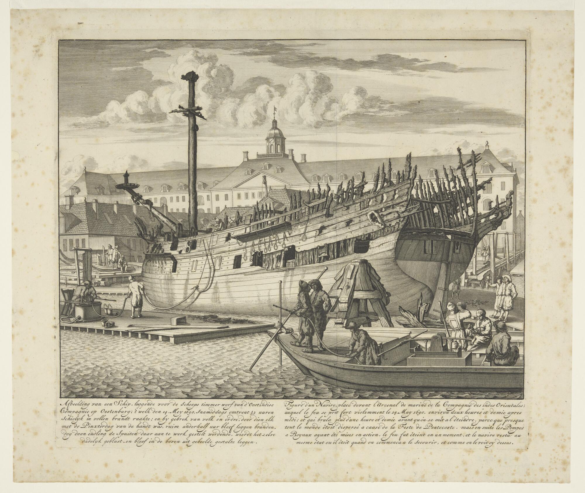 Een door brand geblakerde Oostindiëvaarder in aanbou...