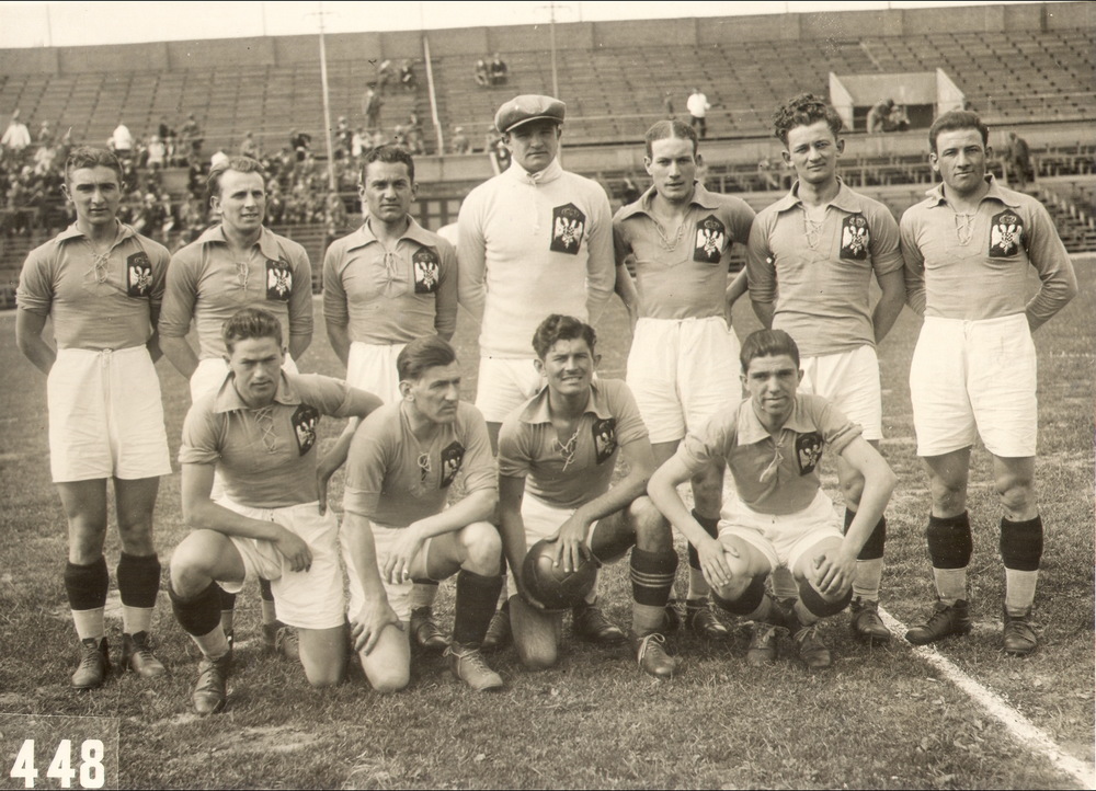 Een zwart-witfoto van de Nederlandse ploeg van de Ol...