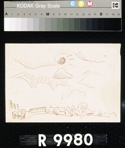 Dorpsgezicht (recto); stilleven van boeket bloemen e...