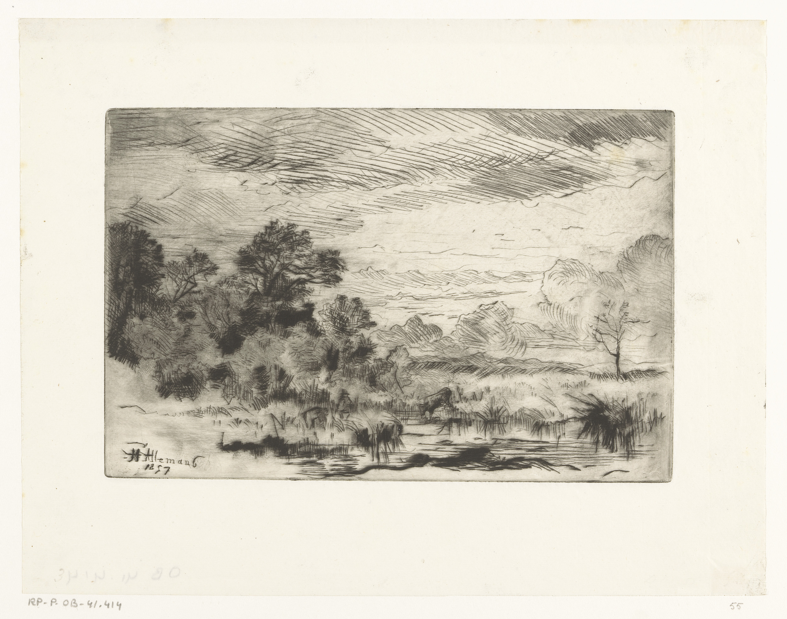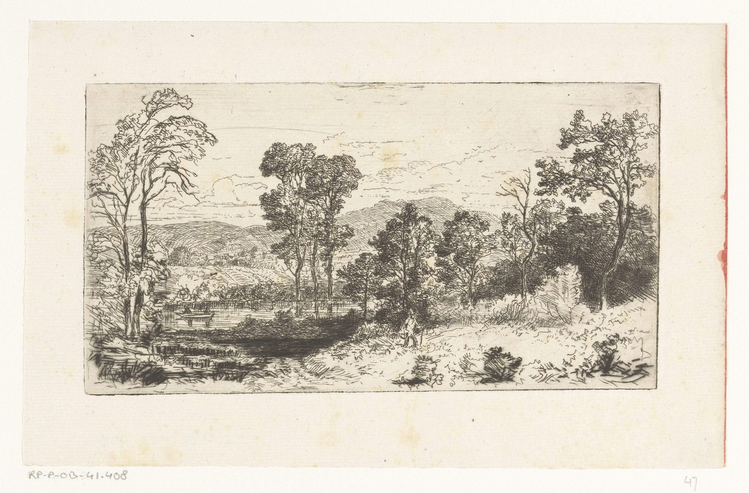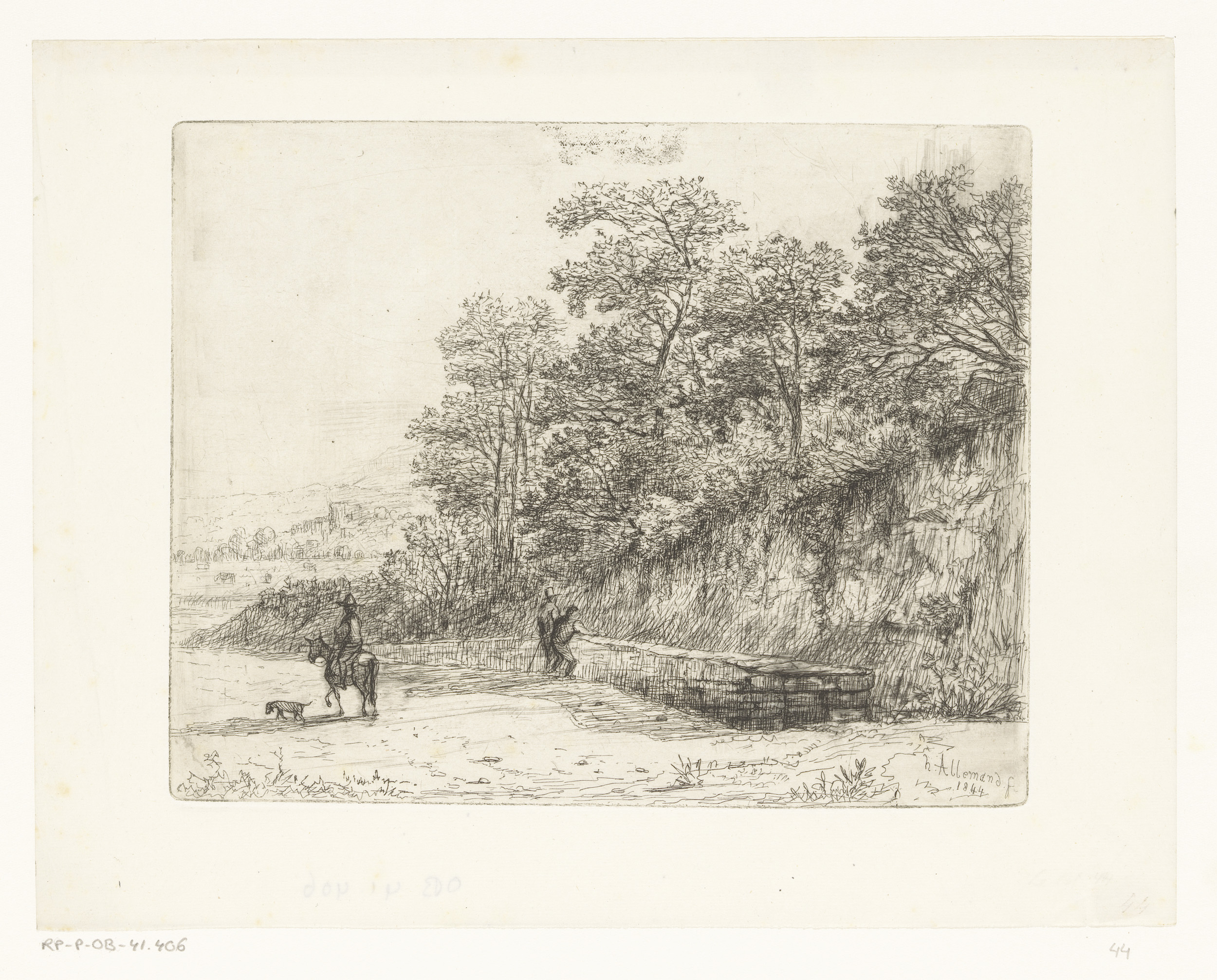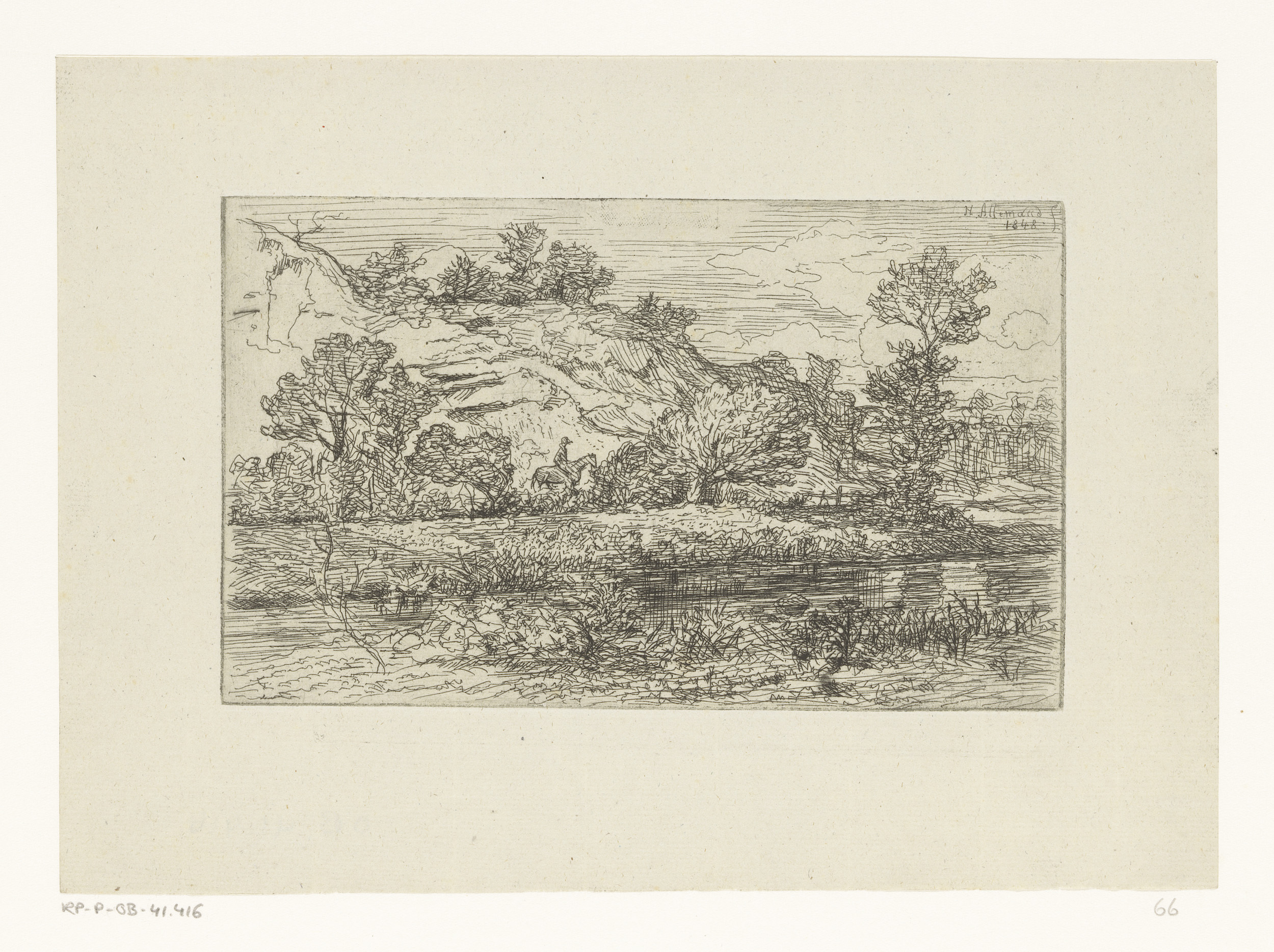 Tekenende figuur en een ruiter in heuvelachtig lands...