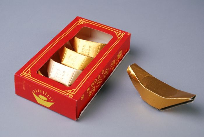 Vijf kartonnen goudstaven, attributen bij de viering...