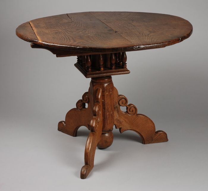 Ronde eikenhouten tafel, op een poot met drie staand...