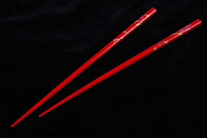 Twee rood gelakte houten eetstokjes of chopsticks