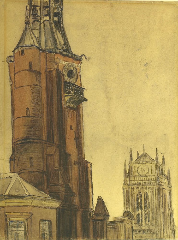 gezicht op de Gasthuistoren en van de toren van de S...